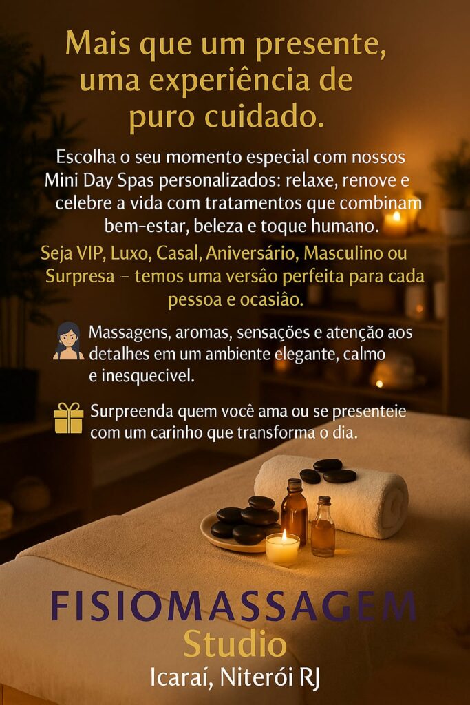 Na Fisiomassagem Studio em Niterói RJ, o nosso Massagem e Spa Luxo – também conhecido como Day Spa, Spa ou Mini Day Spa – é a escolha perfeita para quem busca qualidade, requinte e bem-estar absoluto. Localizado em Icaraí, com fácil acesso à região Oceânica, São Gonçalo e Rio de Janeiro, este tratamento transforma seu momento de relaxamento em uma verdadeira experiência premium.